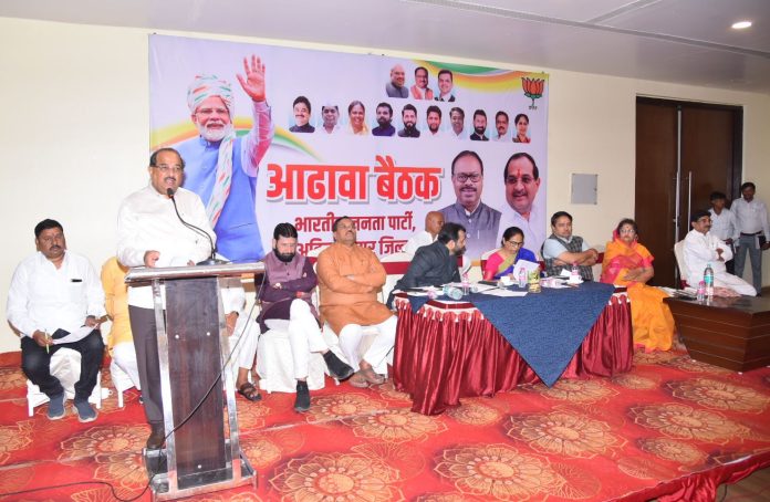 आगामी स्‍थानिक स्‍वराज्‍य निवडणूकीतही जिल्‍ह्यामध्‍ये शतप्रतिशत भाजपाच्‍या विजयाचा निर्धार करण्‍याचा संकल्‍प करा – जलसंपदामंत्री ना.राधाकृष्‍ण विखे पाटील शिर्डी येथे आधिवेशनाची नियोजन आढावा बैठक संपन्‍न