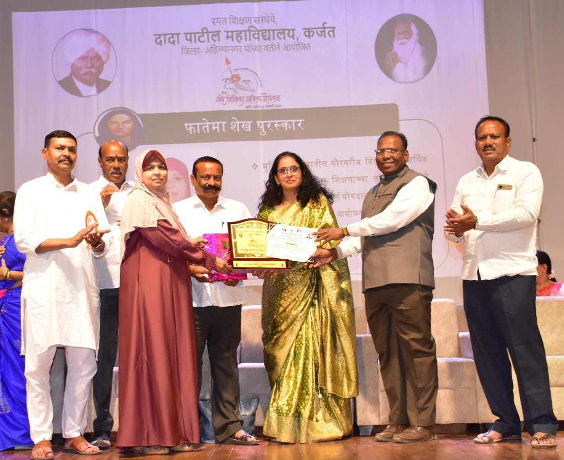 श्रीरामपूर ( जनता आवाज वृत्तसेवा):- येथील नगरपालिका शाळा क्रमांक,शाळा क्रमांक नऊच्या माजी मुख्याध्यापिका शेख नाजिया अब्दुल रहमान यांनी शैक्षणिक क्षेत्रात केलेल्या उल्लेखनीय कार्याबद्दल कर्जत येथील दादा पाटील महाविद्यालयाने सावित्रीबाई फुले यांच्या जयंतीदिनी आयोजित तिसऱ्या राज्यस्तरीय महिलासंमेलनात फातिमा शेख पुरस्कार देऊन सन्मानित करण्यात आले.