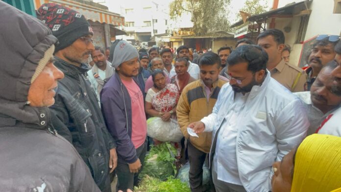 संगमनेर तालुक्यातील शेतकरी दररोज सकाळी नेहरू चौकात भाजीपाला आणि शेतमाल व्यापाऱ्यांना विकण्यासाठी येत असतात. या शेतकर्याच्या अडीअडचणी व समस्या जाणून घेण्यासाठी आ अमोल खताळ यांनी शहरातील नेहरू चौकामध्ये गेले होते. त्यांनी शेतकऱ्यांची भेट घेत संवाद साधला आणि त्यांच्या असणाऱ्या आडीअडचणी जाणून घेतल्या. त्यावेळी कष्टाने आम्ही शेतकरी शेतमाल पिकवतो त्यासाठी लागणारी कीटकनाशके मजुरी यातून शेतकर्याच्या पदरी काहीच पडत नाही. शेतमाल विक्री केल्यानंतर काही थोडेफार पैसे शिल्लक राहतात त्यामध्ये नगरपालिका कररूपाने शेतकर्याकडून पैसे काढून घेत आहे. पालिकेच्या कराची पावती गेल्यानंतर शेतकऱ्यांकडे थोडेफार पैसे शिल्लक राहत असतात.त्यातच गाडी भाडे इंधन खर्च होत असतो. त्यामुळे त्या शेतकऱ्याकडे थोडेफार पैसे शिल्लक राह तात त्यावरच त्याला त्याचा उदरनिर्वाह चालवावा लागत आहे.त्यामुळे शेतकर्यां