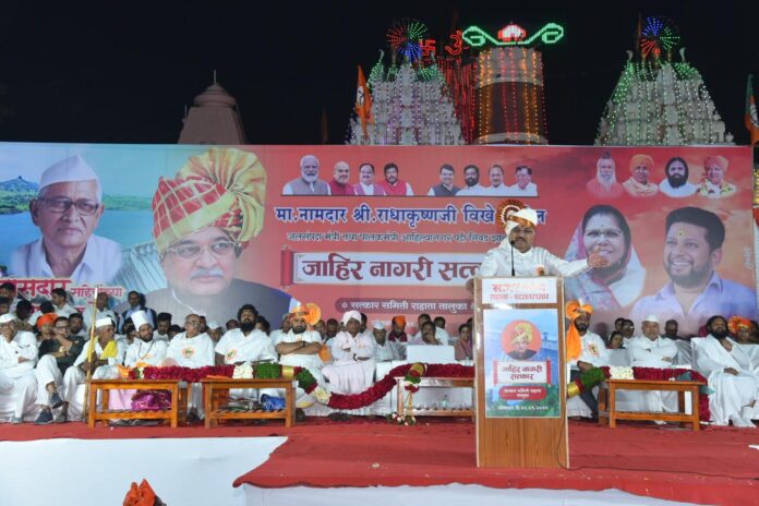 राहाता तालुक्याच्या वतीने ना.राधाकृष्ण विखे पाटील यांच्या नागरी सत्कार सोहळ्याचे आयोजन विरभद्र मंदिराच्या प्रांगणात करण्यात आले होते. जेष्ठनेते माजी मंत्री आण्णासाहेब म्हस्के पाटील यांच्या अध्यक्षतेखाली झालेल्या या सत्कार सोहळ्यात आ.विठ्ठलराव लंघे, आ.अमोल खताळ यांचाही सन्मान करण्यात आला. ह.भ.प उध्दव महाराज मंडलिक, गुरुवर्य परमानंद महाराज, गुरुवर्य कृष्णनाथ बाबा लाड, महंत रमेशगिरीजी महाराज यांच्यासह सर्व संस्थाचे पदाधिकारी मोठ्या संख्येने उपस्थित होते. सत्कार सोहळ्यापुर्वी ना.विखे पाटील यांची भव्य मिरवणूक शहरातील प्रमुख मार्गावरुन काढण्यात आली.