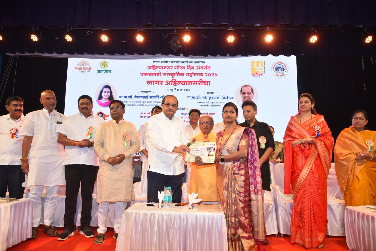 अहील्यानगर( जनता आवाज वृत्तसेवा):-अहील्यादेवीच्या विचारांशी सुसंगत असा सांस्कृतिक महोत्सव आयोजित करून जिल्ह्यचा सांस्कृतिक नावलौकीक अधिक उंचावण्याचा यशस्वी प्रयत्न विचार भारती आणि जनसेवा फाउंडेशनच्या माध्यमातून झाला असल्याचे गौरवोद्गार जलसंपदा तथा पालक मंत्री ना राधाकृष्ण विखे पाटील यांनी काढले.