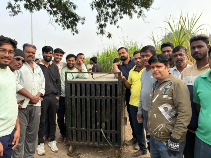 कोल्हार (जनता आवाज वृत्तसेवा):- कोल्हार येथील बेलापूर रोड लगत असलेल्या बाग मळ्यात बुधवार दिनांक 21 जानेवारी रोजी पहाटे साडेपाचच्या दरम्यान येथील कोल्हार बुद्रुकचे ग्रामपंचायत सदस्य अमोल खर्डे यांच्या घराजवळील रमेश खर्डे यांच्या शेतात दोन दिवसांपूर्वीच पिंजरा लावण्यात आला होता. यामध्ये साधारण आठ ते नऊ वर्षाची बिबट्या(मादी) जेरबंद झाली आहे.