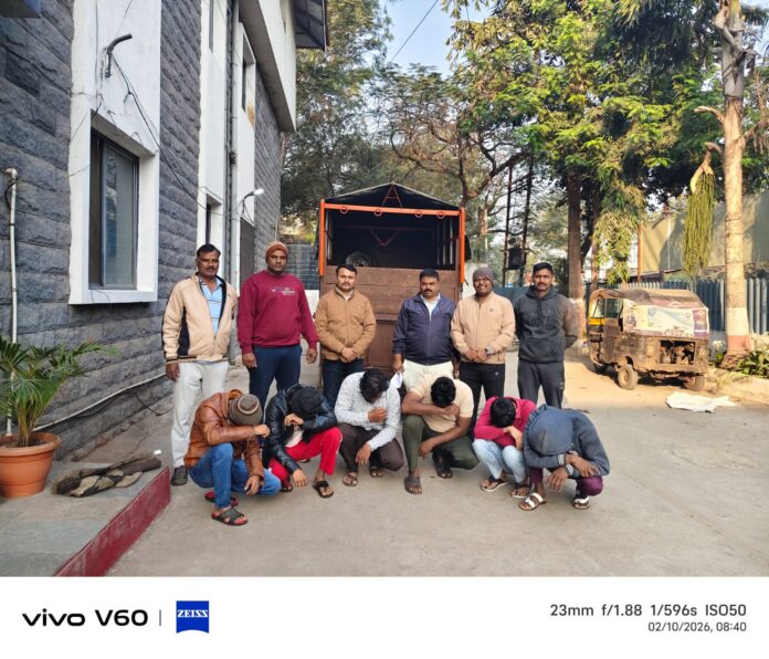 पोलिसांनी घटनास्थळी धाड टाकली असता, काही लोक कत्तल केलेले मांस टेम्पोमध्ये भरताना रंगेहाथ आढळले. पोलिसांना पाहताच आरोपींनी पळ काढण्याचा प्रयत्न केला, मात्र पथकाने पाठलाग करून फैज कुरेशी, सद्दम कुरेशी, कलिम सय्यद, मुलमफरिद कुरेशी, अनस कुरेशी, फैसल कुरेशी आणि जुनेद कुरेशी या सात जणांना जागीच ताब्यात घेतले.
