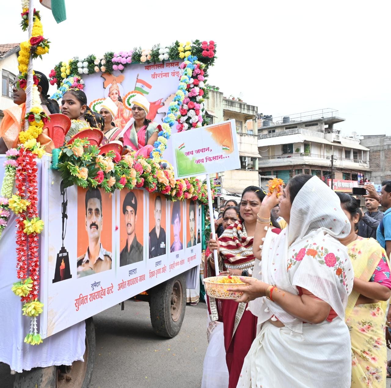 या रॅलीत फुलांनी सजविलेल्या केलेल्या ट्रॅक्टरमध्ये भारतमातेच्या प्रतिमेसोबत देशाचे रक्षण करताना शहीद झालेले कोपरगाव तालुक्यातील सुभेदार सुनील रावसाहेब वलटे (रा. दहेगाव बोलका) यांची वीरपत्नी मंगलाताई वलटे, हवालदार अमोल माधवराव जाधव (रा. मुर्शतपूर) यांची वीरपत्नी शोभाताई जाधव, हवालदार दीपक कृष्णा आहेर (रा. कोळपेवाडी) यांची वीरपत्नी कल्पनाताई आहेर, नायक पुंजाहरी चांगदेव भालेराव (रा. ओगदी) यांचे बंधू जितेंद्र भालेराव, शिपाई बाळू नाना पगारे (रा. भोजडे) यांची आई चंद्रभागा पगारे तसेच त्यांची मुले विराजमान झाली होती. रॅलीला प्रारंभ होताना माजी आमदार तथा भाजप नेत्या स्नेहलताताई कोल्हे यांनी या वीरमाता व वीरपत्नींवर पुष्पवृष्टी करत वंदन केले व त्यांचा सन्मान केला. तसेच त्यांची आस्थेने विचारपूस केली. भारतमातेच्या रक्षणासाठी कोपरगाव तालुक्यातील पाच भूमिपुत्रांनी आपले बलिदान दिले, त्यांचा आम्हा सर्वांना सार्थ अभिमान आहे. आम्ही व सर्व देशवासीय त्यांचे बलिदान कधीही विसरू शकत नाही, असे सांगून स्नेहलताताई कोल्हे यांनी सर्व वीरमाता व वीरपत्नींच्या त्याग व समर्पणाबद्दल त्यांचे मन:पूर्वक आभार मानले. नंतर त्यांनी पायी चालत या रॅलीत सहभाग नोंदवला. या रॅलीच्या अग्रभागी बॅंड पथक, स्काऊट-गाईड पथक, राष्ट्रीय छात्र सेनेचे (एनसीसी) विद्यार्थी होते. हातात तिरंगा ध्वज तसेच ‘वीरांना वंदन, मातीला नमन’, ‘जय जवान, जय किसान’, असे विविध फलक घेऊन काढलेल्या या रॅलीतील ‘ए मेरे वतन के लोगो…’, ‘मेरे देश की धरती…’, ‘हर करम अपना करेंगे ए वतन तेरे लिए…’ यासारख्या देशभक्तीपर गीतांनी वातावरण चैतन्यदायी बनले होते. रॅलीत ‘ज्ञानोबा माऊली, तुकाराम’ चा गजर करणारे शालेय विद्यार्थी नागरिकांचे लक्ष वेधून घेत होते. या रॅलीच्या मार्गावर ठिकठिकाणी विविध पक्ष, संस्था, संघटना व नागरिकांनी रॅलीचे उत्स्फूर्त स्वागत केले.