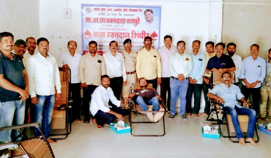 राहुरी ( जनता आवाज वृत्तसेवा ):-प्रसाद शुगर कारखान्याचे कार्यस्थळावर आज मा. राज्यमंत्री आमदार श्री. प्राजक्त प्रसादराव तनपुरे यांचे वाढदिवसानिमीत्त भव्य रक्तदान शिबीराचे आयोजन केलेले होते. या रक्तदान शिबीराचे उदघाटन कारखान्याचे वर्क्स मॅनेजर मा. श्री. संजय म्हस्के यांचे शुभहस्ते करण्यात आले. या प्रसंगी कारखान्यातील सर्व खातेप्रमुख, विभागप्रमुख अधिकारी व कामगार मोठ्या संख्येने उपस्थित होते.