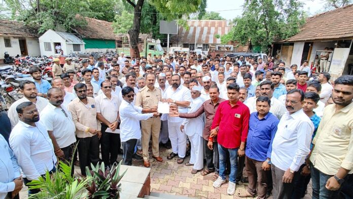 राहुरी( जनता आवाज वृत्तसेवा):- राहुरी येथे देसवंडी ता.राहुरी येथिल गावात गुरुवार दि.१४/०९/२०२३ रोजी बैल पोळा सणाच्या दिवशी सायंकाळी काही तरुणांन मध्ये किरकोळ वाद होऊन राहुरी पोलिस ठाण्यात गुन्हा दाखल करण्यात आला होता.त्यानंतर गावातील काही अपप्रवृत्तींच्या लोकांनी खोटा ॲट्रॉसिटीचा गुन्हा दाखल केला, त्याच्या निषेधार्त मराठा एकीकरण समिती राहुरी तालुका व देसवंडी गावाचे ग्रामस्थ यांच्या वतीने निषेध नोंदवत राहुरी पोलिस ठाण्याचे पो.नि. धनंजय जाधव यांना निवेदन देण्यात आले.