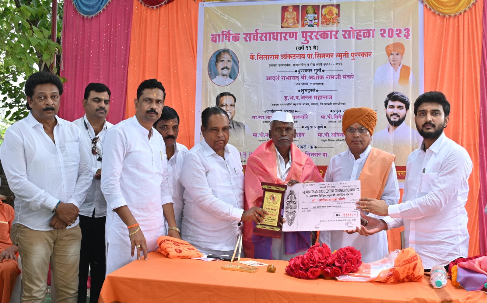कोपरगाव तालुक्यातील भोजडे येथील भोजडे नंबर २ विविध कार्यकारी सेवा सहकारी सोसायटी लि. च्या वतीने कै. सीताराम व्यंकटराव सिनगर यांच्या स्मरणार्थ देण्यात येणारा सन २०२३ चा आदर्श सभासद पुरस्कार अशोकराव रामजी मंचरे यांना सदगुरू नारायणगिरी महाराज आश्रम डवाळा (ता. वैजापूर) येथील ह. भ. प. भरत महाराज व सहकार महर्षी शंकरराव कोल्हे सहकारी साखर कारखान्याचे चेअरमन विवेकभैय्या कोल्हे यांच्या हस्ते गुरुवारी (२८ सप्टेंबर) प्रदान करण्यात आला. त्याप्रसंगी ते बोलत होते. अध्यक्षस्थानी माजी खासदार भाऊसाहेब वाकचौरे होते.