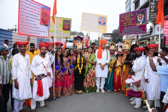 कोळपेवाडी ( जनता आवाज वृत्तसेवा ) :- आदिशक्ती सप्तश्रुंगी देवींच्या चरण स्पर्श झालेल्या पादुकांचे कोपरगाव शहरात सोमवार (दि.१६) रोजी साधू संतांच्या उपस्थितीत ढोल पथकांच्या निनादात आणि तुतारीच्या आवाजात भव्य दिव्य स्वरुपात आकर्षकरित्या सजविलेल्या पालखीतून काढण्यात आलेल्या मिरवणुकीच्या सोहळ्याला भाविकांची मोठी गर्दी उसळली होतो. यावेळी कोपरगाव शहरातील चौकाचौकात असंख्य भाविकांनी पालखीचे पूजन करून आदिशक्ती सप्तश्रुंगी देवीच्या चरण स्पर्श झालेल्या पादुकांचे मनोभावे दर्शन घेतले.