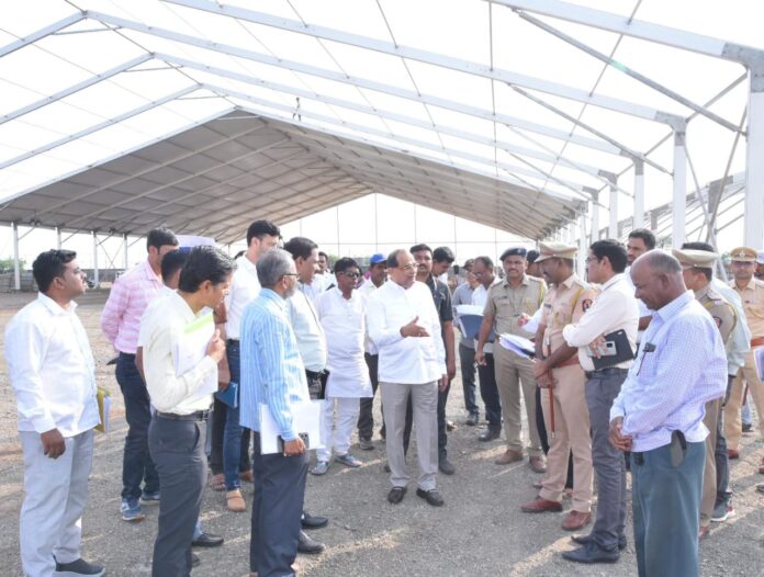 शिर्डी, दि.२२ ( जनता आवाज वृत्तसेवा ):-पंतप्रधान नरेंद्र मोदी यांच्या उपस्थितीत काकडी येथे संपन्न होणा-या भव्य शेतकरी आणि लाभार्थी मेळाव्याची जय्यद तयारी सुरु झाली असून, भव्य अशा सभामंडपाच्या उभारणीचे कामही सुरु करण्यात आले आहे. एक लाख लोकांना बसता येईल अशा तीन मंडपांची उपभारणी याठीकाणी करण्यात येत असून, या सर्व तयारीची पाहाणी महसूल तथा पालकमंत्री ना.राधाकृष्ण विखे पाटील यांनी आज आधिका-यां समवेत केली.