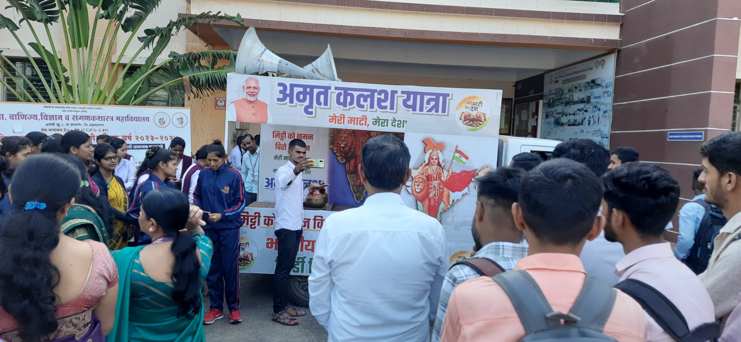 महाराष्ट्र राज्याचे पशुसंवर्धन व दुग्धविकास मंत्री ना. राधाकृष्ण विखे पाटील यांचे मार्गदर्शनाखाली आश्वी परिसरात अमृत कलश रथ यात्रेचे आयोजन करण्यात आले होते. महाविद्यालयातील राष्ट्रीय सेवा योजनेचे कार्यक्रम अधिकारी प्रा. अमित शिंदे व समवेत स्वयंसेवक ऋषिकेश पाबळ, राम खुळे ,प्रमोद दत्तात्रय हे अमृत कलश घेऊन दिल्ली येथे होणाऱ्या कार्यक्रमास उपस्थित राहणार आहे.