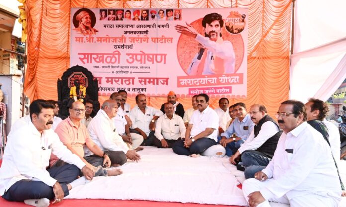 मराठा आरक्षणाच्या मागणीसाठी अंतरवाली सराटी येथे आमरण उपोषणाला बसलेले मनोज जरांगे पाटील यांच्या उपोषणाचा आजचा सातवा दिवस आहे. त्यांच्या समर्थनार्थ कोपरगाव शहर व तालुका सकल मराठा समाजाच्या वतीने कोपरगाव शहरात छत्रपती शिवाजी महाराज स्मारकाजवळ साखळी उपोषण सुरू आहे. माजी आमदार स्नेहलताताई कोल्हे यांची प्रकृती सध्या ठीक नसल्याने त्यांनी आज मंगळवारी (३१ ऑक्टोबर) भ्रमणध्वनीवरून या उपोषणकर्त्यांशी संपर्क साधून उपोषणाला पाठिंबा जाहीर केला. संजीवनी उद्योग समुहाचे अध्यक्ष बिपीनदादा कोल्हे यांनी मंगळवारी सायंकाळी उपोषणस्थळी भेट देऊन उपोषणकर्त्यांना पाठिंबा दिला. त्यांनी उपोषणकर्ते विनय भगत, अनिल गायकवाड, बाळासाहेब जाधव, अमित आढाव, सुनील साळुंके यांच्याशी चर्चा केली. यावेळी सहकारमहर्षी शंकरराव कोल्हे सहकारी साखर कारखान्याचे माजी संचालक बाळासाहेब नरोडे, माजी नगराध्यक्ष राजेंद्र शिंदे, दिलीपशेठ दारुणकर, राजेंद्र सोनवणे, भाजपचे शहराध्यक्ष डी. आर. काले, माजी नगरसेवक बबलूशेठ वाणी, संजय जगदाळे, नसीरभाई सय्यद, विवेक सोनवणे, अबुजरभाई शेख, रवींद्र रोहमारे, संतोष साबळे, प्रा. दत्तात्रय गाढे, प्रा. बाळासाहेब वडांगळे, प्रा. गिरमकर, मुन्ना दरपेल, रोहन दरपेल, राजेंद्र डागा, साई नरोडे, दीपक पंजाबी, रुपेश सिनगर आदींसह मराठा समाजबांधव, भाजपचे पदाधिकारी, कार्यकर्ते मोठ्या संख्येने उपस्थित होते.