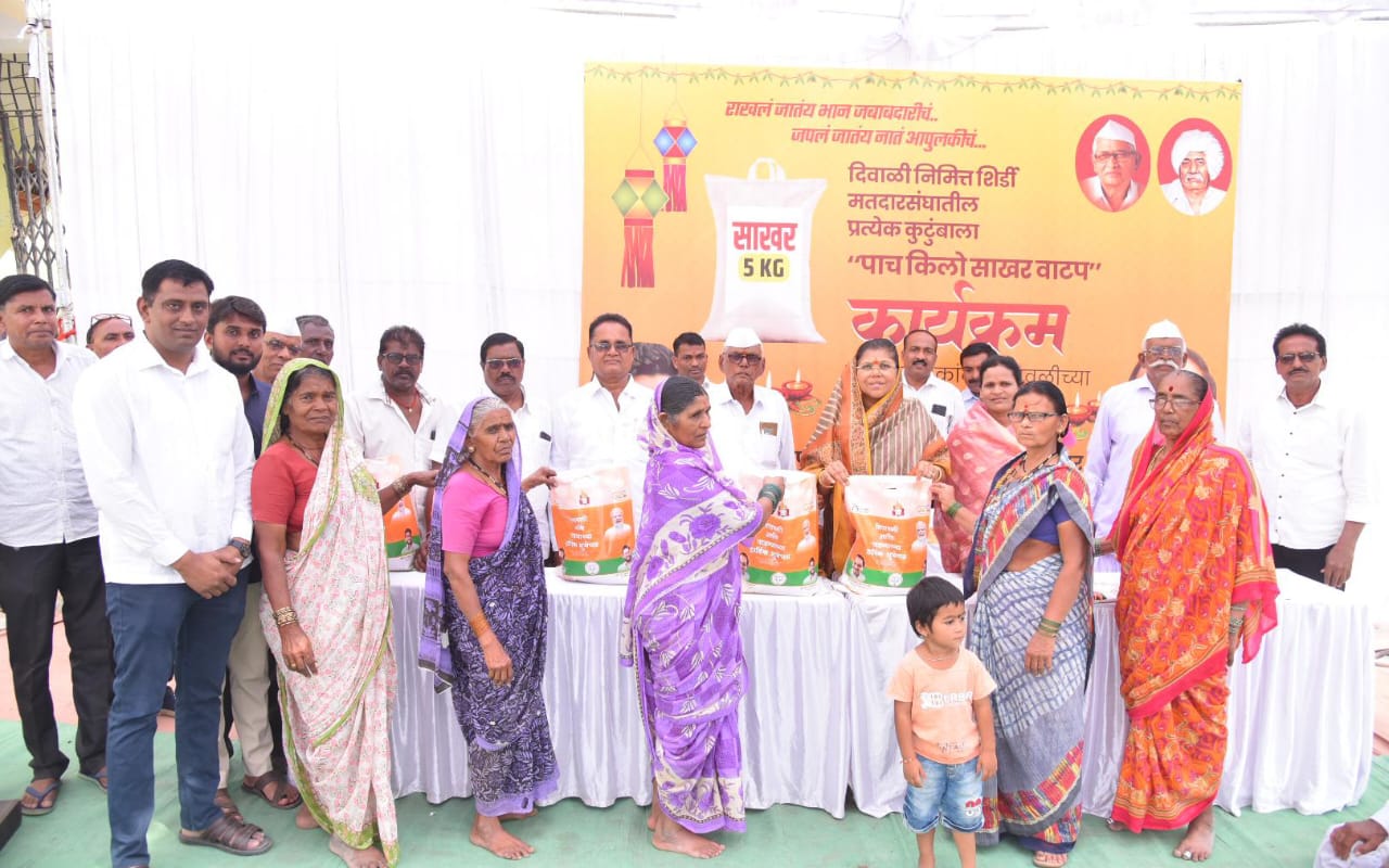 शिर्डी मतदार संघातील जोर्वे गटातील मनोली, रहीमपूर, कोल्हेवाडी, ओझर बु. व ओझर खुर्द, कनकापूर, निंबाळे आणि कनोली या गावांमध्ये विखे पाटील कुटूंबियांच्या वतीने दिवाळी सणाचे औचित्य साधून साखर वितरण सुरु करण्यात आले आहे. या कार्यक्रमात सौ. शालिनीताई विखे पाटील यांनी प्रातिनिधीक स्वरुपात साखर वाटप करुन, सर्वांना शुभेच्छा दिल्या.