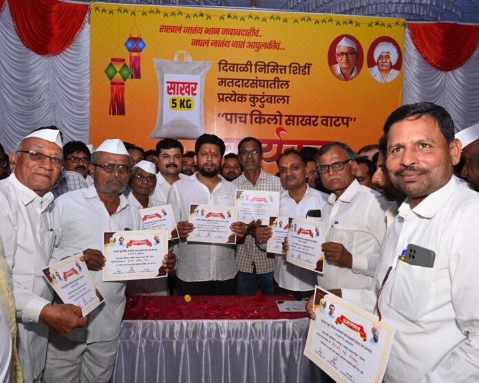 दरम्यान दिवाळीच्या सणानिमित्त शिर्डी मतदारसंघातील प्रत्येक कुटुंबाला नामदार राधाकृष्ण विखे पाटील यांच्या संकल्पनेतून पाच किलो मोफत साखर वाटप केली जात असून आज केलवड येथे खासदार सुजय विखे पाटील यांच्या हस्ते साखर वाटप देखील करण्यात आले.