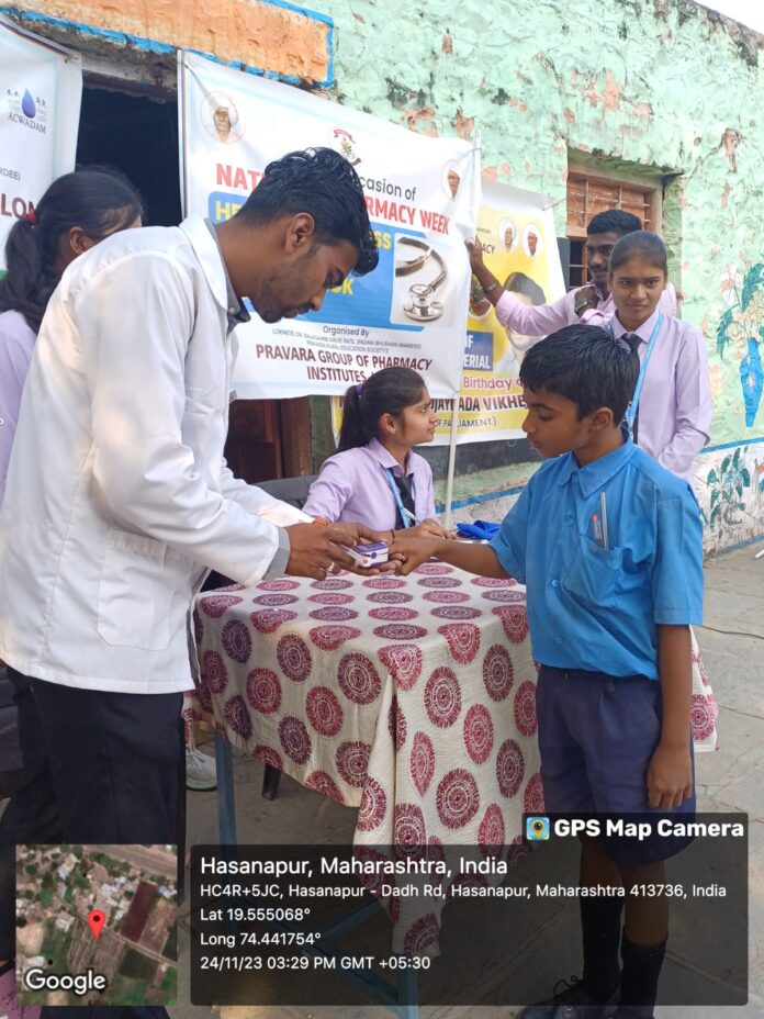 विद्यार्थ्यांनी आरोग्य विषयक जनजागरण फेरी, तसेच हसनापूर जिल्हा परिषद व उर्दू शाळा येथील मुलांची आरोग्य तपासणी करून त्यांना स्वच्छते विषयी मार्गदर्शन केले .याप्रसंगी द्वितीय वर्ष पदवी अभ्यासक्रमातील विद्यार्थिनी कुमारी अश्विनी खेमनर हिने फार्मसी क्षेत्राचे महत्त्व या विषयावर आपले मनोगत व्यक्त केले. या आरोग्य जनजागरण फेरीमध्ये पदविका व पदवी पदवी अभ्यासक्रमाचे सर्व विद्यार्थी, महाविद्यालयाचे सर्व शिक्षक व शिक्षक कर्मचारी उपस्थित होते. हा उपक्रम यशस्वी होण्यासाठी डॉ. विशाल तांबे प्राध्यापक अर्चना राजदेव व प्राध्यापक अर्चना कदम यांनी विशेष परिश्रम घेतले.