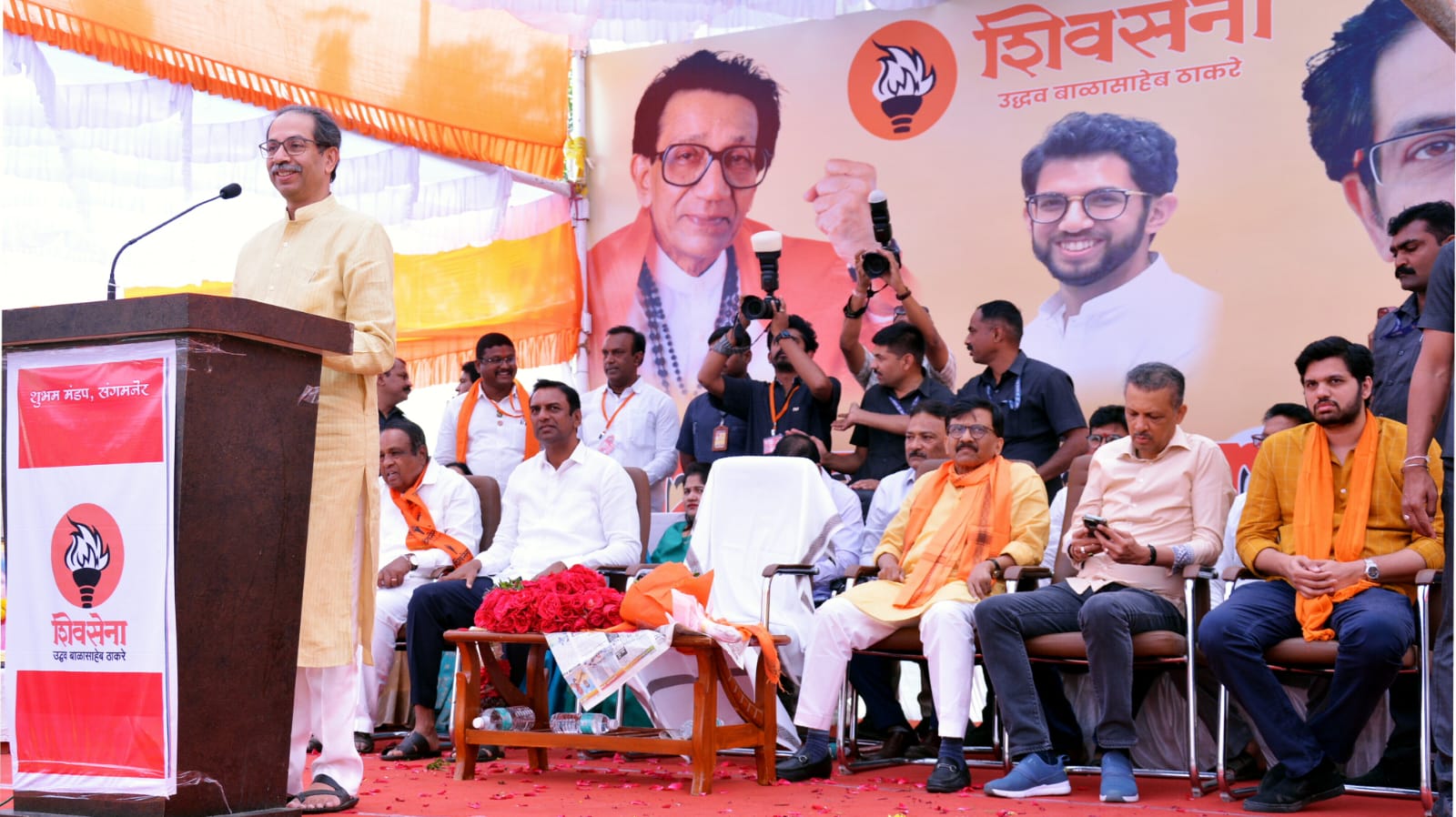 संगमनेर येथील बस स्थानकावर शिवसेना पक्षप्रमुख उद्धव ठाकरे यांच्या प्रमुख उपस्थितीत झालेल्या जनसंवाद मेळाव्यात मार्गदर्शन करताना ते बोलत होते. यावेळी व्यासपिठावर खा. संजय राऊत, मिलींद नार्वेकर, वरूण सरदेसाई, सहसंपर्क प्रमुख राजेंद्र झावरे, जिल्हा प्रमुख रावसाहेब खेवरे, संपर्कप्रमुख ॲड दिलीप साळगट शहर प्रमुख आप्पासाहेब केसेकर विधानसभा संघटक कैलास वाकचौरे उपशहर प्रमुख पप्पू कानकाटे माजी शहर प्रमुख अमर कतारी महिला आघाडी प्रमुख शितल हासे दिव्यांग सहाय्य सेना जालिंदर लाहामगे युवा सेनेचे जिल्हाध्यक्ष अमित चव्हाण अमोल कवडे मुस्लिम मावळा आजीज मोमीन गुलाब भोसले अशोक सातपुते संदीप राहणे सर शिवसैनिक मोठ्या संख्येने