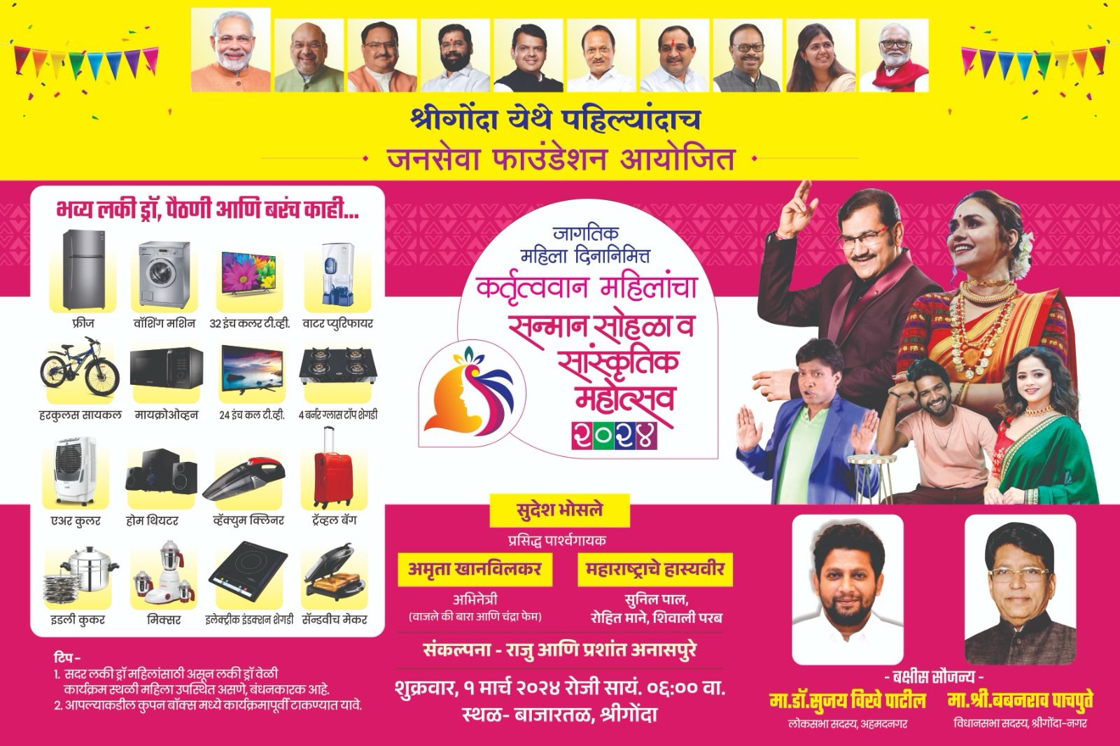 जागतिक महिला दिनानिमित्त कर्तृत्ववान महिलांचा होणार सन्मान: खा. डॉ. सुजय विखे पाटील महिला दिनाच्या अनुषंगाने जनसेवा फाउंडेशनच्या वतीने सांस्कृतिक महोत्सव २०२४ चे आयोजन..