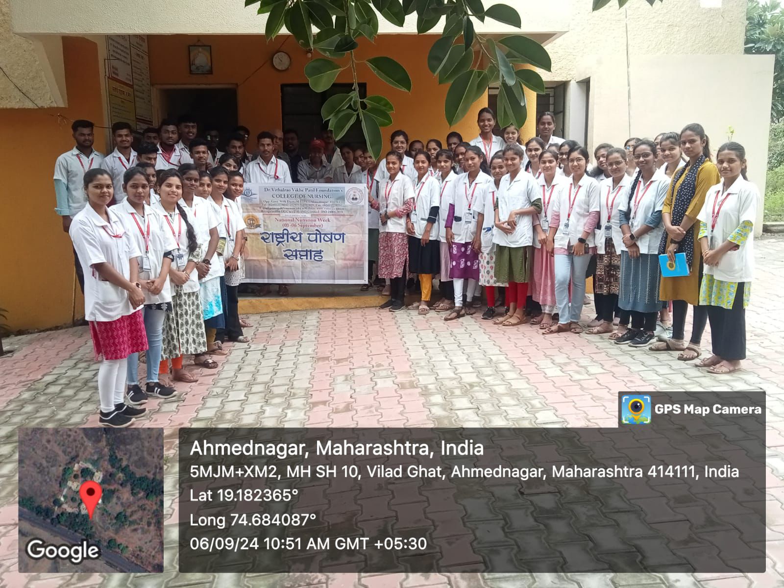 दरवर्षी, राष्ट्रीय पोषण सप्ताहासाठी एक विशिष्ट थीम निवडली जात असून यावर्षीच्या सप्ताहाचे घोषवाक्य ‘सर्वांसाठी पोषक आहार’ असे असून जीवनाच्या सर्व टप्प्यांवर लोकांच्या पौष्टिक गरजा पूर्ण करणाऱ्या आहारांना प्रोत्साहन देण्यावर ते लक्ष केंद्रित करते. सर्व गटातील लोकांसाठी निरोगी आणि पौष्टिक आहाराचे महत्त्व अधोरेखित करण्यासाठी यावर्षी डॉ. विठ्ठलराव विखे पाटील महाविद्यालयाने सात दिवस विविध कार्यक्रमांचे आयोजन केले होते. यामध्ये प्रामुख्याने अंगणवाडीतील मुलांचा आहार तपासणी सर्वेक्षण व आरोग्य तपासणी, नर्सिंगच्या मुलींसाठी आहाराचे नियोजन कसे असावे याविषयी व्याख्यान, प्रसुती झालेल्या मातांना फळांचे वाटप, मातोश्री वृद्धाश्रमात फळांचे वाटप आणि पोस्टर प्रदर्शनाद्वारे समतोल आहाराविषयी जनजागृती करणे, असे विविध कार्यक्रम आयोजित करण्यात आले होते.