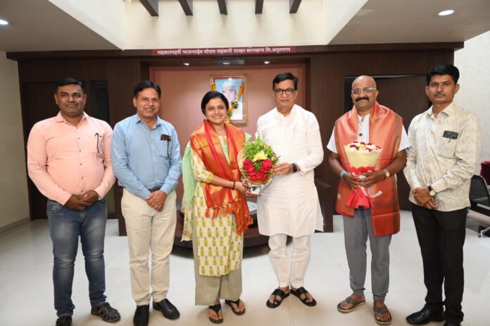 सहकार महर्षी भाऊसाहेब थोरात कारखाना कार्यस्थळावर चित्रपट अभिनेते वैभव मांगले व सिने अभिनेत्री भार्गवी चिरमुले यांनी आमदार थोरात यांची भेट घेतली याप्रसंगी मा. आमदार डॉ. सुधीर तांबे, इंद्रजीत भाऊ थोरात,कार्यकारी संचालक जगन्नाथ घुगरकर ,अमृत सांस्कृतिक मंडळाचे रामदास तांबडे, संदीप दिघे ,अशोक कवडे ,नामदेव कहांडळ, राजू बड व संचालक उपस्थित होते.