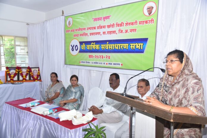 प्रवरा फळे भाजीपाला उत्पादक प्रक्रिया खरेदी विक्री शेतकरी सहकारी संस्था प्रवरानगरच्य ४० व्या वार्षिक सर्वसाधारण सभेत सौ विखे पाटील बोलत होत्या. संस्थेच्या अध्यक्षा गीताताई थेटे यांच्या अध्यक्षतेखाली झालेल्या या वार्षिक सर्वसाधारण सभेला सभेला ट्रक सोसायटीचे अध्यक्ष नंदूशेठ राठी, विखे पाटील कारखान्याचे माजी अध्यक्ष अण्णासाहेब कडू , प्रवरा बँकेचे संचालक राजेंद्र राऊत, पंढरीनाथ खर्डे, विखे पाटील कारखान्याचे संचालक धनंजय दळे, अॅड आप्पासाहेब दिघे, उपाध्यक्ष शालिग्राम चंद दत्ता पाटील, मकरंद गुणे, अण्णासाहेब जोशी विजय लगड, रामनाथ आहेर, उत्तमराव गाडेकर, माधवराव कडसकर, सौ वैशाली गिरमे व्यवस्थापक प्रदीप सोनवणे आदींसह सभासद मोठ्या संख्येने उपस्थित होते.