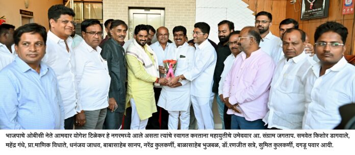 यावेळी किशोर डागवाले म्हणाले, आ. योगेश टिळेकर हे ओबीसी समाजाचे उभरते नेतृत्व आहे. त्यांनी केलेल्या कामाची पावतीच त्यांना विधानपरिषदेच्या सदस्यत्वाच्या माध्यमातून मिळाली आहे. चांगल्या समाज कामाची दखल घ्त्लीच जाते. नगर मधील ओबीसी समाजाच्या मेळाव्यासाठी आ. टिळेकर यांनी एक दिवस द्यावा. याधीच्या काँग्रेसच्या राजवटीत महात्मा ज्योतिबा फुले व सावित्रीबाई फुले यांच्या पुण्यातील भिडे वाड्याचे राष्ट्रीय स्मारक झाले नाही. गेल्या ७० वर्षांपासून प्रलंबित असलेल्या या मागीस राज्यातील महायुती सरकारने त्वरित मंजुरी दिली. उपमुख्यमंत्री देवेंद्र फडणवीस यांच्या प्रयत्नातून देशाचे पंतप्रधान नरेंद्र मोदींच्या हस्ते स्मारकाचे भूमिपूजनही झाले. तसेच महायुती सरकारने संत सावता महाराजांच्या अरण या तीर्थक्षेत्राला ‘अ’ दर्जा देऊन १०० कोटी रुपयांचा निधीही दिला आहे. राज्यातील महायुती सरकारने ओबीसी समाजाला मोठा न्याय दिला आहे. त्यामुळे राज्यात पुन्हा महायुतीचेच सरकार यावे यासाठी या निवडणुकीत महायुतीचे उमेदवार आ.संग्राम जगताप यांना विजयी करावे, असे आवाहन केले.